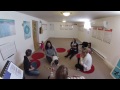 Parenting Tip: Sing “Old MacDonald Had a Farm” with your little one. Pause after key parts of the song, such as “E-I-E-I-O” and wait for your baby to respond. You can also explore the different sounds the animals on the farm make like these families did in Kindermusik class: